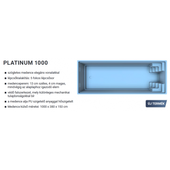 PLATINUM 1000 - Üvegszálas kompozit medence A Ceramicwall medence felépítése garantálja az ozmózis elleni teljes védelmet, a hagyományos medencékkel szembeni hosszabb élettartamot, és a rendkívül egyszerű telepítést, valamint a zökkenőmentes üzemeltetést. A Ceramicwall medence erőssége a falának struktúrájában rejlik. Kiemelkedő minőség kerámiaréteggel. Minden medence acél merevítő konzollal rendelkezik mely elengedhetetlen a szállítás - daruzás és telepítés során. A medencék már rolókamrával is rendelhetőek. Állítható támasztólábak a medence oldalfalához és a lépcsőhöz külön rendelhetőek. Tulajdonságai - szögletes medence elegáns vonalakkal - lépcsőkialakítás: 5 fokos lépcsősor - medenceperem: 13 cm széles, 4 cm magas, mindvégig az alaplaphoz igazodó elem - védő falszerkezet, mely különleges mechanikai tulajdonságokkal bír - a medence alja PU szigetelő anyaggal hőszigetelt - medence külső méretei: 1000 x 380 x 153 cm Kompozit medencék rétegezése 1-2-3. réteg: egy 3 dimenziós multicolor medencefelület, mely egy fröccstechnológiával egymás utáni rétegben felvitt Gelcoat (első poliészter gélréteg) réteg 4. réteg: Barriercoat felvitele után egy vinilészter gyanta (vinilacetát gyanta) puffer-réteg, üvegszállal eldolgozva. Ez a réteg a legfőbb garancia a teljes struktúrára, a hosszú ozmózis ellenállás, és a kivételes mechanikai tulajdonságok garanciája 5. réteg: speciális vinilészter gyanta - kerámia maganyag keverék, mely szintén az ozmózis ellenállásra van kifejlesztve. Ez a keverék a legmodernebb kutatási eredményeket és fejlett nanotechnológia jelenlétét mutatja. (Ceramicwall) 6. réteg: általános üvegszállal erősített poliészter váz 7. réteg: Poliamid szövet ütésálló, extra rugalmas aramidszálas szöveterősítés 8. réteg: általános üvegszállal erősített poliészter váz