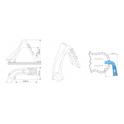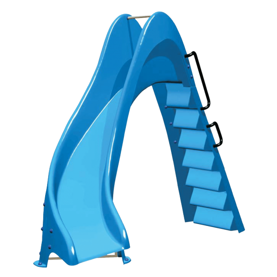 Balos lépcsős csúszda A biztonsági korlátból kijövő vízköpők felelnek a csúszdarész nedvesen tartásáért. Csúszásmentes lépcsőfokokkal és alumínium fogantyúkkal ellátott lépcsők. Gyorscsatlakozó tömlőhöz. Üvegszálas csúszda UV-védelemmel.