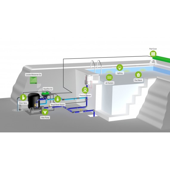 Az Aquastar® Air egy Loxone® miniszerveren keresztül a Loxone® intelligens otthoni rendszerbe integrálható. Ez az integráció számos új alkalmazási lehetőséget nyit meg, mivel az intelligens otthon és az intelligens medence funkciók kombinálhatók és együtt használhatók.