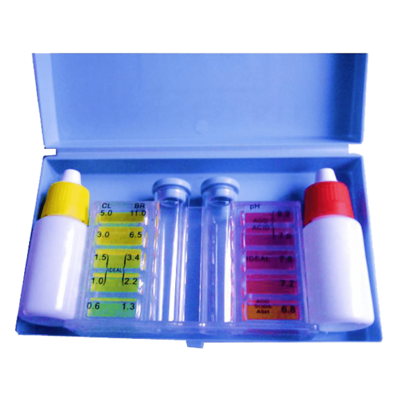 Folyadékos vízelemző. 2 az 1-ben teszt készlet, két folyékony reagenst tartalmaz. Szabad klór / bróm, pH mérésére.